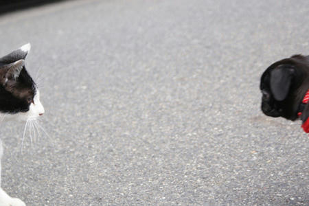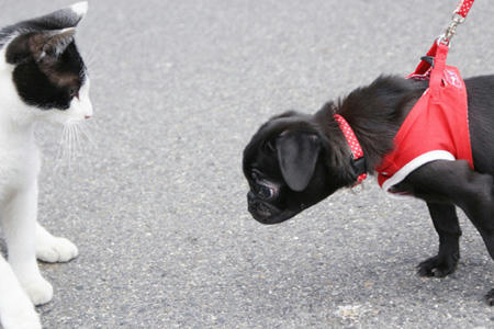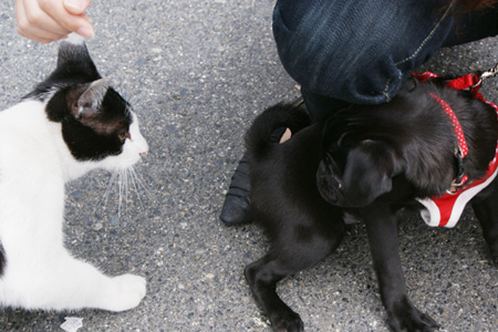 恐いもの知らず駒子は物珍しげに猫に近づく