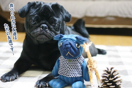 駒子ちゃん、素敵なお友達が増えましたねぇ♪鼻の辺りが、ホントにパグの特徴をよく捕らえていらっしゃって、なんとも味のある青ちんちゃんです。きっと、駒子ちゃんのなが~いお友達になることでしょう(#^.^#)