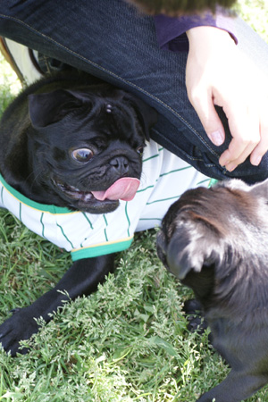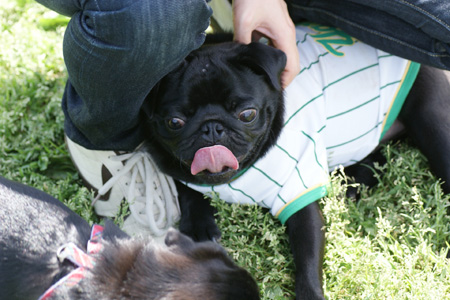 ベースボールシャツがよく似合う、黒パグの男の子 ガッツ君です
