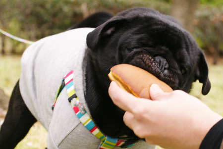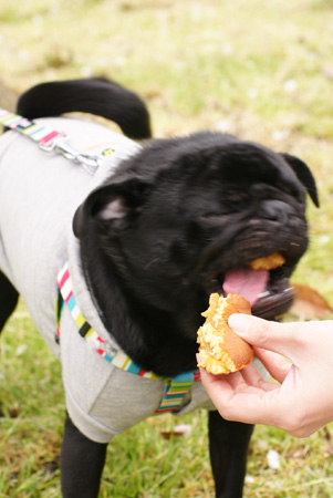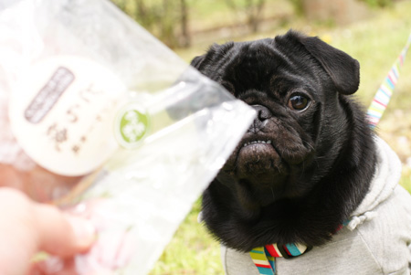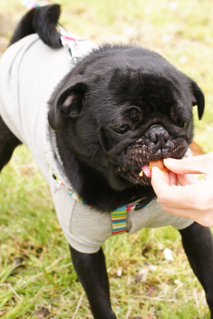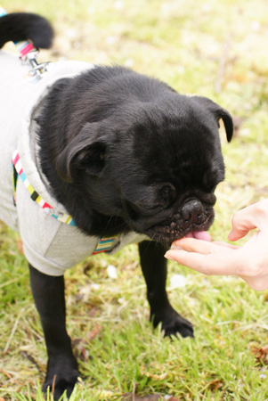 とりあえず全部口に入れようとするいやしいパグ↑